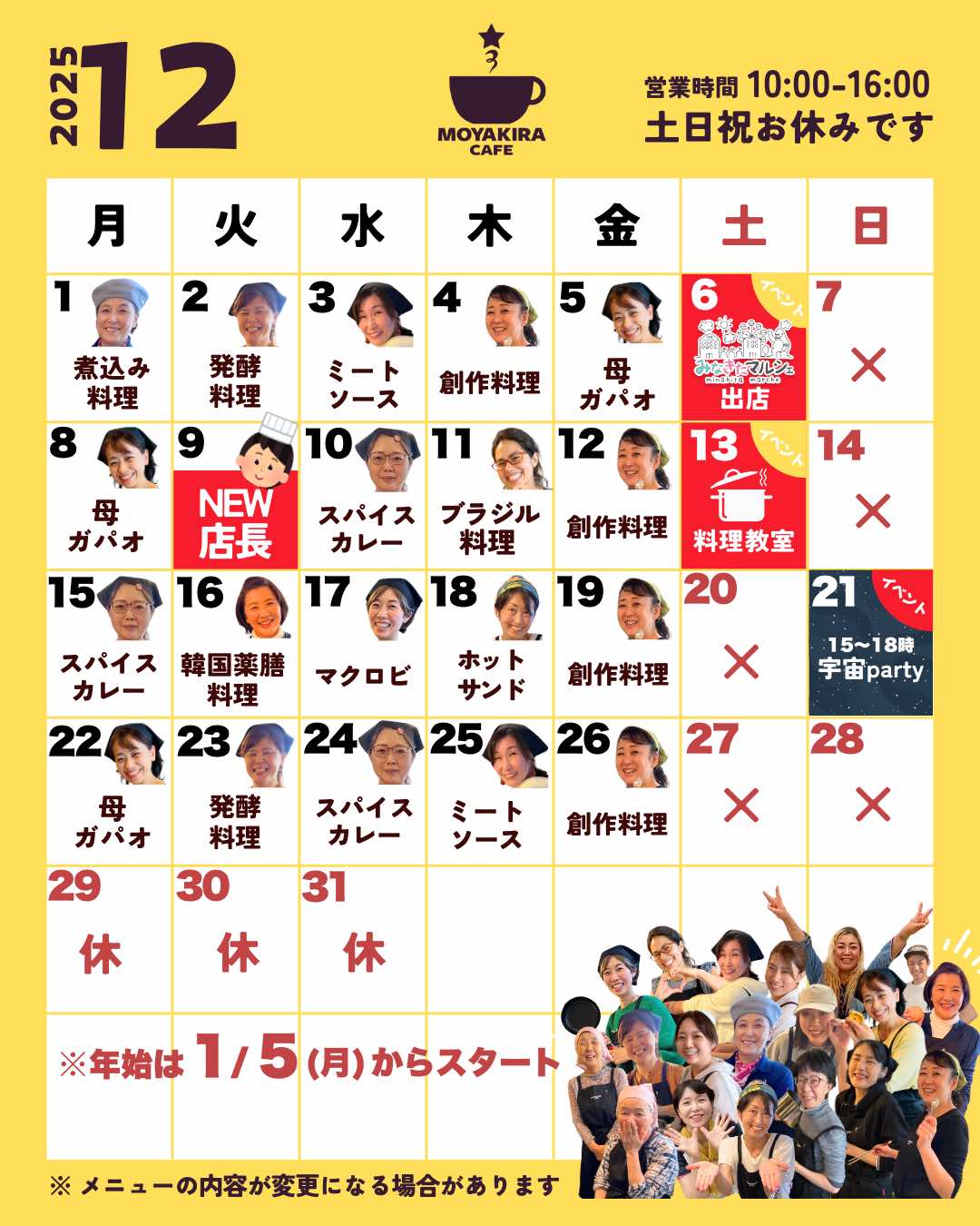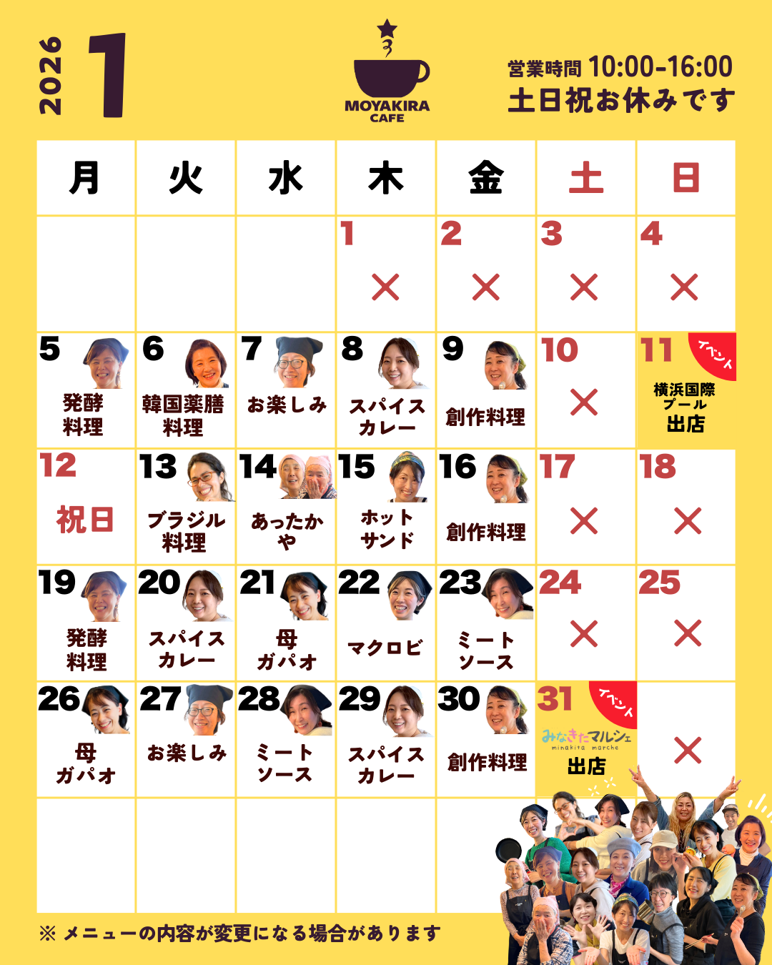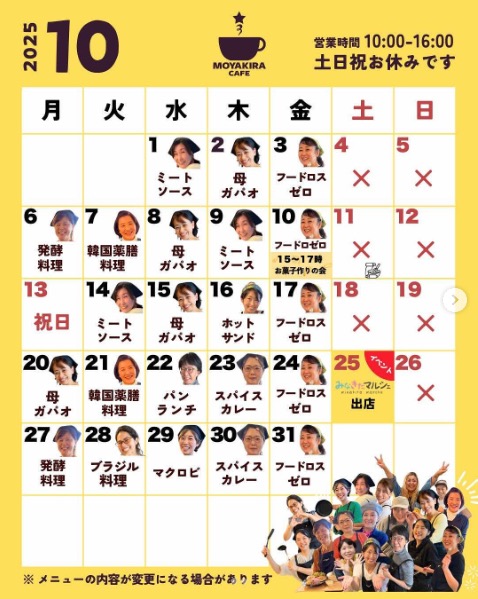 モヤキラCAFEでは毎日、和食や家庭料理、カレーやエスニックなど異なるジャンルの専門家が店長を務めます。ランチは日替わりで、本格的なワンプレートをご用意。訪れるたびに、全く新しい味わいをお楽しみいただけます。